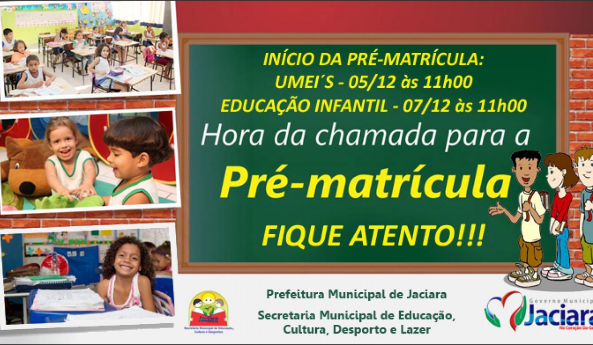 Segundo a secretária municipal de Educação, Lúcia Marcidelli, a pré-matrícula para os alunos com idades até 4 anos, das Unidades Municipais de Educação Infantil (UMEI´s/Creches) será das 11 horas desta segunda segunda-feira (05) até às 23h59 do dia seguinte (06.12). Já para a Educação Infantil (pré-escola), será no das 11 horas do dia 7 de dezembro até às 23h59 do dia seguinte (08.12).