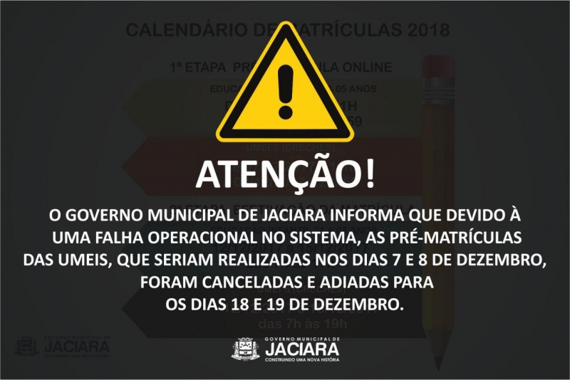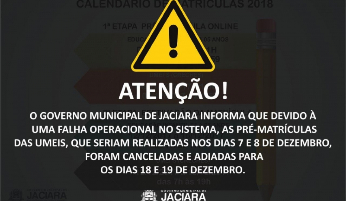 A equipe do Núcleo de Tecnologia da Informação percebeu a falha, suspendeu as matrículas e os processos foram cancelados. Por este motivo, as novas datas para as pré-matrículas das Creches Municipais, serão nos dias 18 e 19 de dezembro, segunda e terça-feira. Vale ressaltar, que a confirmação do processo será realizado entre os dias 20 e 22 nas unidades.