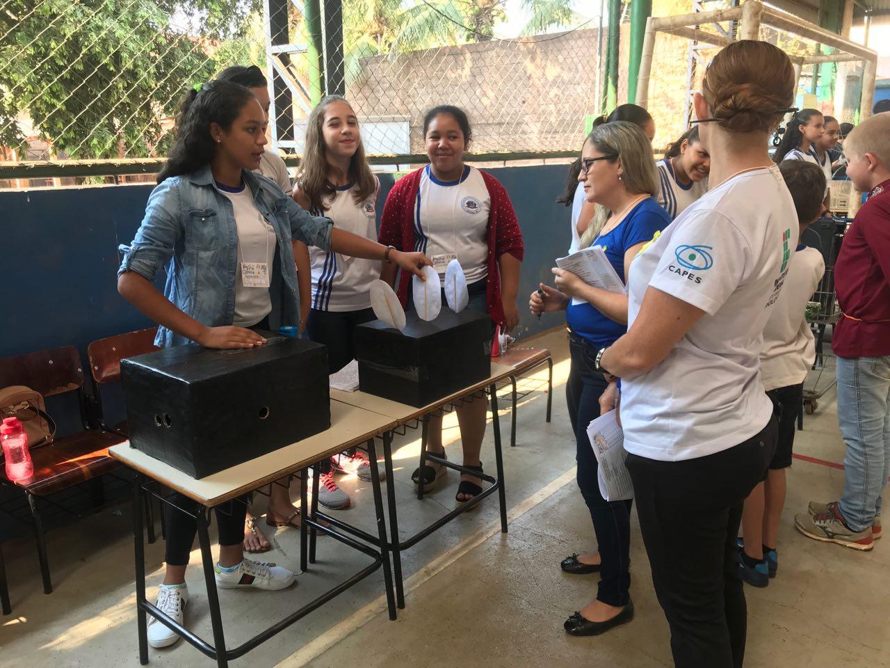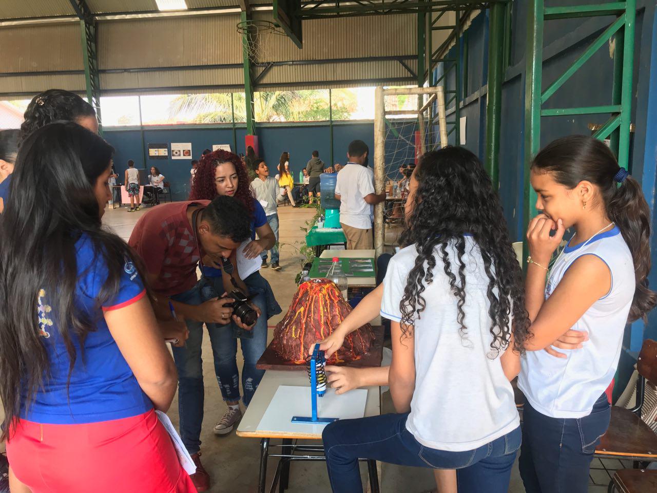 Já o trio de estudantes, Maria Clara, Jéssica Aparecida e Giovana Martins, fizeram uma maquete de um vulcão em erupção, a experiência chamou a atenção de quem passou pela mesa das meninas. "Um vulcão é formado pelo chocamento ou deslocamento de placas tectônicas, elas se batem e formam um buraco no interior da terra, no interior da terra tem lava, essa lava vai sair. Temos aqui um sismógrafo que é usado para medir a intensidade dos terremotos", esclareceu Maria.