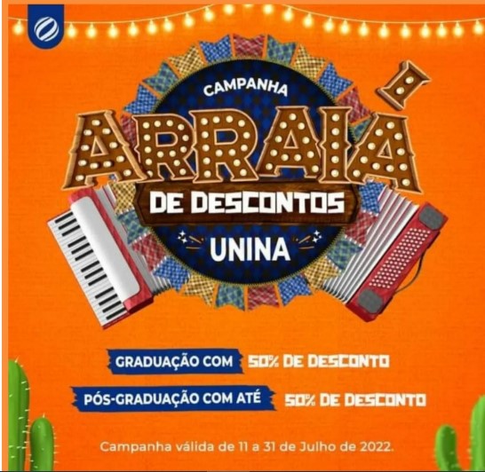 Já a Unina está com a campanha “Arraiá dos Descontos”, oportunizando 50% de descontos ao seus cursos de pós-graduação até o dia 31 de julho. Basta consultar o site da instituição: Faculdade Unina – Cursos de Graduação, Pós-Graduação e Atualizações. O contato pode se feito com a consultora Rosilaine Javarini Ribeiro, pelo telefone (66) 99602-4237.