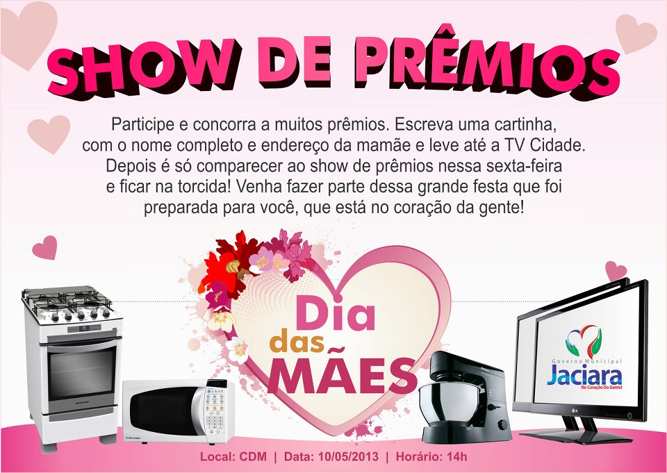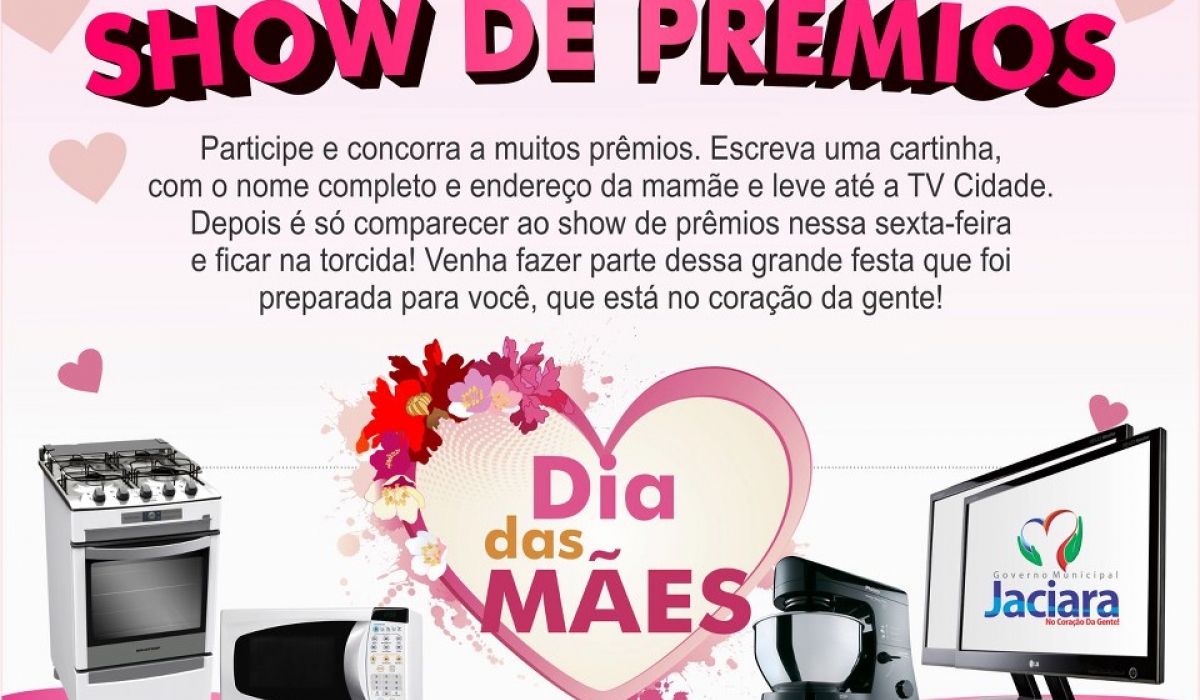 De acordo com a secretária de Educação e primeira dama, Elisabeth Oliveira de Lima, o comércio ajudou muito e os prêmios estão imperdíveis. “A mães vão fazer a festa, temos muita coisa boa, TV de LCD, maquina de lavar, cama Box, fogão, microondas, DVD e vários outros prêmios, como relógio, bolsas, calçados, kits de cosméticos. Será uma grande celebração”, destacou Elisabeth.