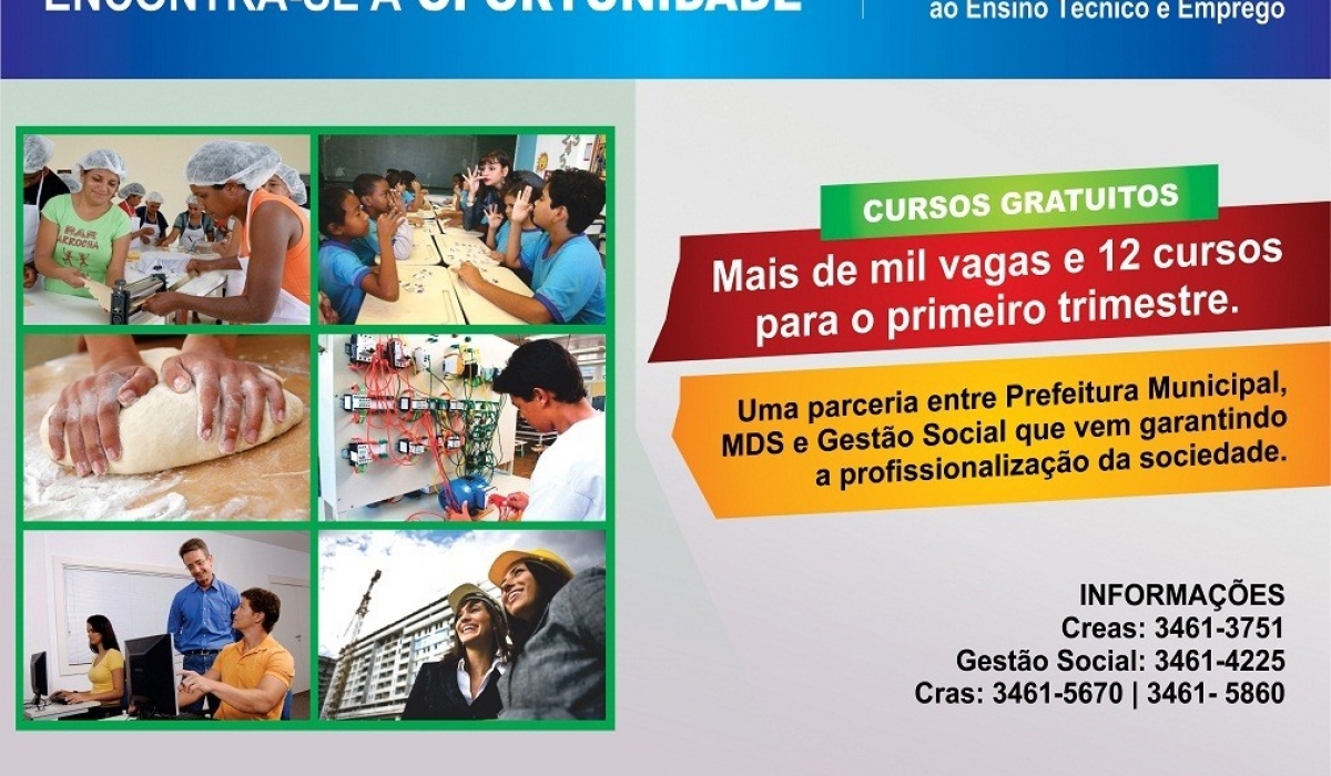 Entre os cursos para este primeiro trimestre estão, Recursos Humanos, Segurança do Trabalho, Salgadeira, Libras, Padeiro, Inglês básico e avançado, Eletricista Industrial, Operador de Computador, entre outros. Os cursos acontecem com o apoio do Senai (Serviço Nacional de Aprendizagem Industria) e Senac (Serviço Nacional de Aprendizagem Comercial) e são oferecidos para alunos do ensino médio e para a população cadastrada nos programas sociais executados pela Secretaria de Gestão Social, por meio dos Centros de Referência de Assistência Social (Cras)