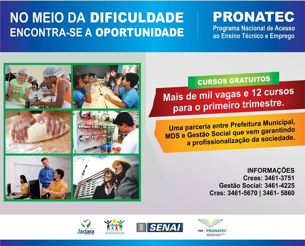 O Pronatec (Programa Nacional de Acesso ao Mundo do Trabalho) está de volta nesse ano de 2014. Serão mais de mil vagas e 12 cursos para garantir profissionalização e um bom emprego. O programa faz parte de uma parceria entre Prefeitura Municipal, MDS e Gestão Social que através do Acessuas/Trabalho realiza o acompanhamento dos cursos e dos alunos, disponibilizando a eles, mais qualidade de aprendizado.