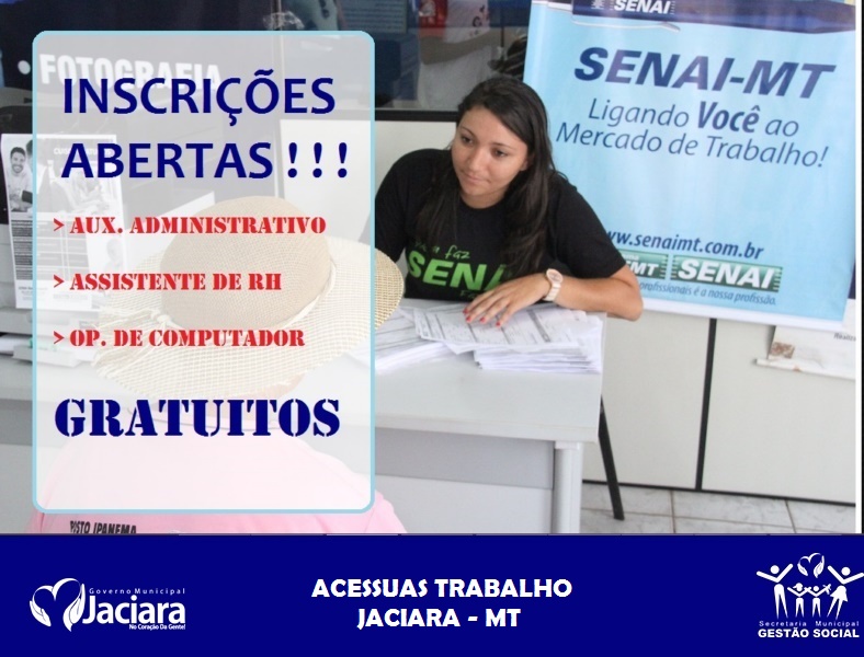 A Prefeitura de Jaciara através da Secretaria Municipal de Gestão Social Informa: Estão abertas as inscrições de 80 vagas para três cursos profissionalizantes. Os interessados deverão ter acima de 14 anos.