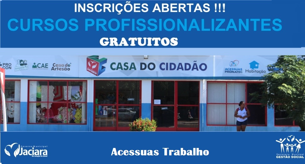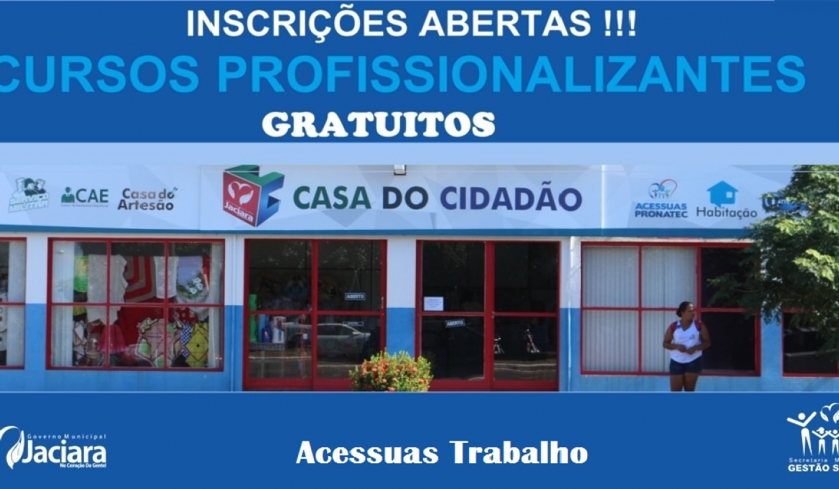 A Prefeitura de Jaciara através da Secretaria Municipal de Gestão Social Informa: Estão abertas as inscrições de 80 vagas para três cursos profissionalizantes ministrados pelo Serviço Nacional de Aprendizagem Comercial (Senac-MT). Os interessados deverão ter acima de 14 anos.