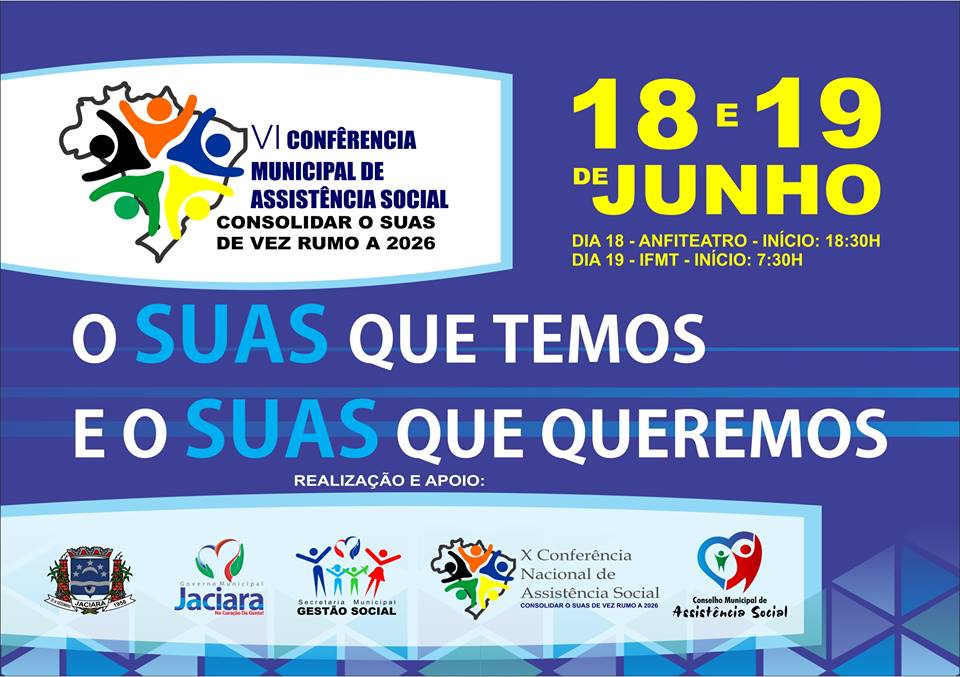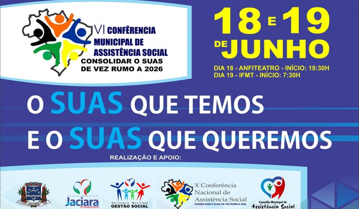 Jaciara sedia a VI Conferência Municipal de Assistência Social com o tema – Consolidar o Suas de Vez Rumo a 2026. O primeiro dia de encontro é nesta quinta-feira (18), às 18h30, no Anfiteatro Jonas Pinheiro e na sexta-feira (19), a partir das 7 horas da manhã, no Instituto Federal de Mato Grosso (IFMT).