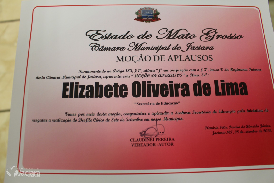De acordo com o vereador, Claudinei Pereira, a indicação para a homenagem, fundamentada no artigo 183 do regimento interno do legislativo jaciarense, é uma forma de reconhecimento do resgate do Desfile Cívico de 7 de Setembro, onde toda a comunidade escolar e outras entidades participaram da grande celebração do patriotismo.