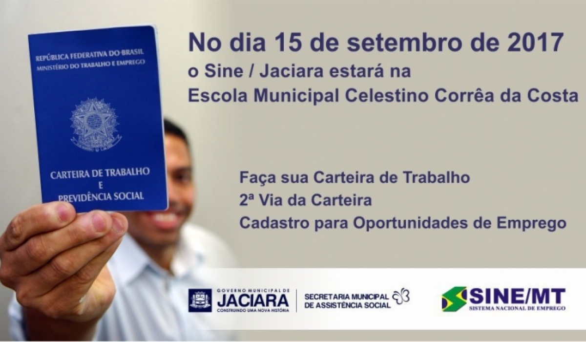 No dia 15 de setembro, das 13h às 17h, as equipes da Secretaria de Assistência Social e Sine (Sistema Nacional de Emprego) estarão no Distrito de Celma para fazer carteiras de trabalho, 2ª via da carteira e cadastro para oportunidades de emprego na Escola Municipal Celestino Correa da Costa.