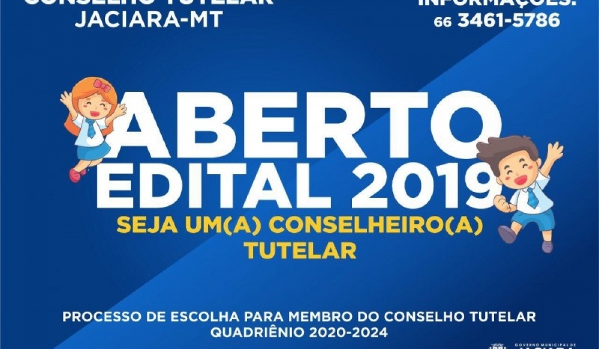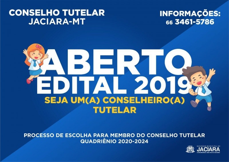 O Governo Municipal de Jaciara por meio do Conselho Municipal dos Direitos da Criança e do Adolescente (CMDCA) abrirá, entre os dias 2 a 30 de maio, o processo de escolha em data unificada para membros do Conselho Tutelar, quadriênio 2020/2023. São cinco vagas para conselheiros tutelares titulares e seus respectivos suplentes escolhidos em ordem decrescente de votação