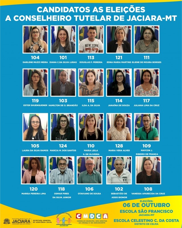A eleição unificada dos cinco novos conselheiros tutelares de Jaciara acontecerá no dia 6 de outubro, domingo, das 8h às 17h, na Escola Estadual São Francisco (Jaciara) e na Escola Estadual Celestino Corrêa da Costa (Distrito de Celma). Estão aptas a votar pessoas que tenham acima de 18 anos, munidas do RG (ou outro documento com foto) e do título de eleitor.