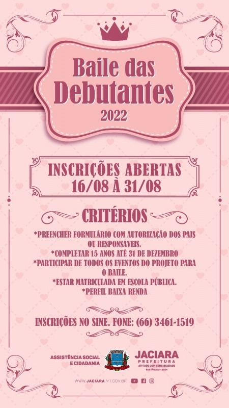 A Secretaria Municipal de Assistência Social e Cidadania abriu nesta segunda-feira (16.08) e vai até 31 de agosto deste ano, as inscrições ao projeto Baile de Debutantes, voltado às meninas que completam 15 anos entre o período de 01 de julho a 31 de dezembro de 2022. O baile será no Centro de Tradições Gaúchas de Jaciara (CTG), no dia 30 de setembro deste ano.