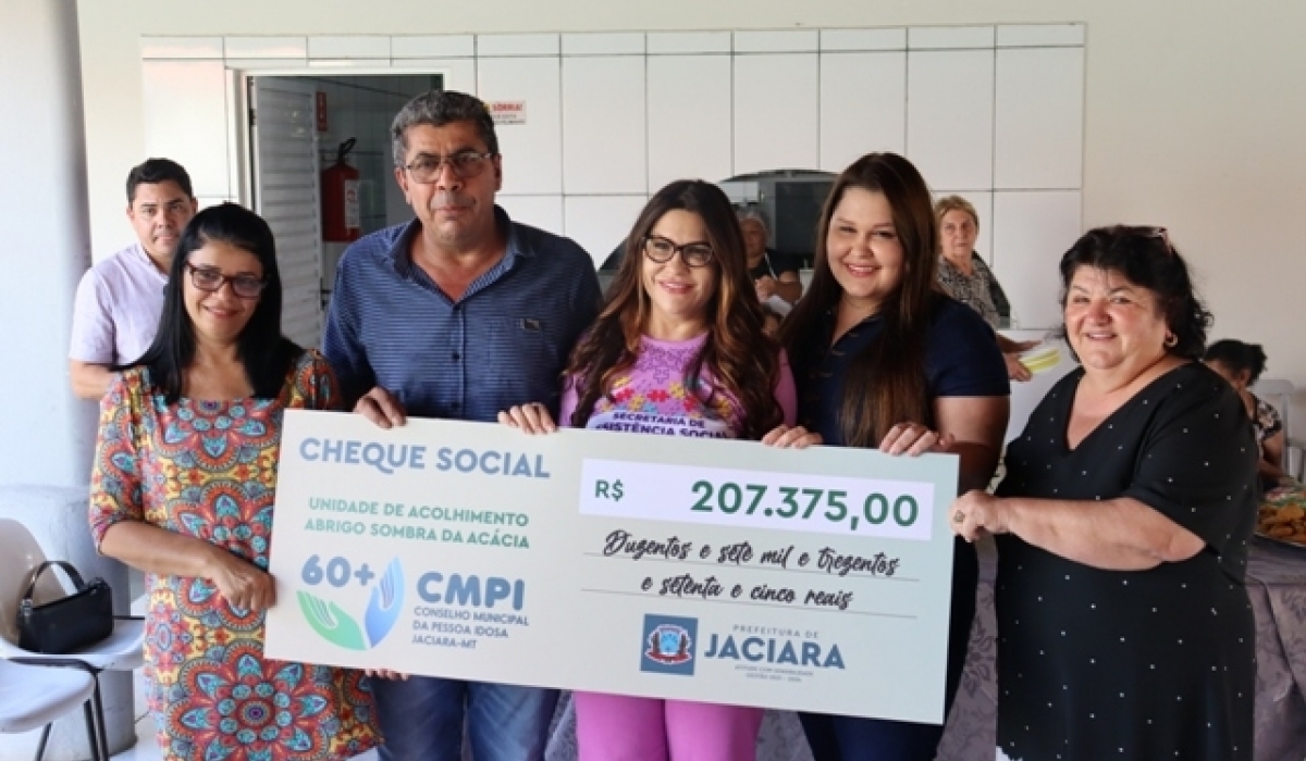 Uma boa noticia para a população jaciarense: a Prefeitura de Jaciara, por meio da Secretaria Municipal de Assistência Social e Cidadania e o Conselho Municipal da Pessoa Idoso, entregaram nesta terça-feira (28.03), um cheque social (recurso público de doação), no valor de R$ 207.375,00 (duzento e sete mil, trezentos setenta e cinco reais) para o Abrigo Sombra de Acácia, que atende 25 pessoas da melhor idade no município.