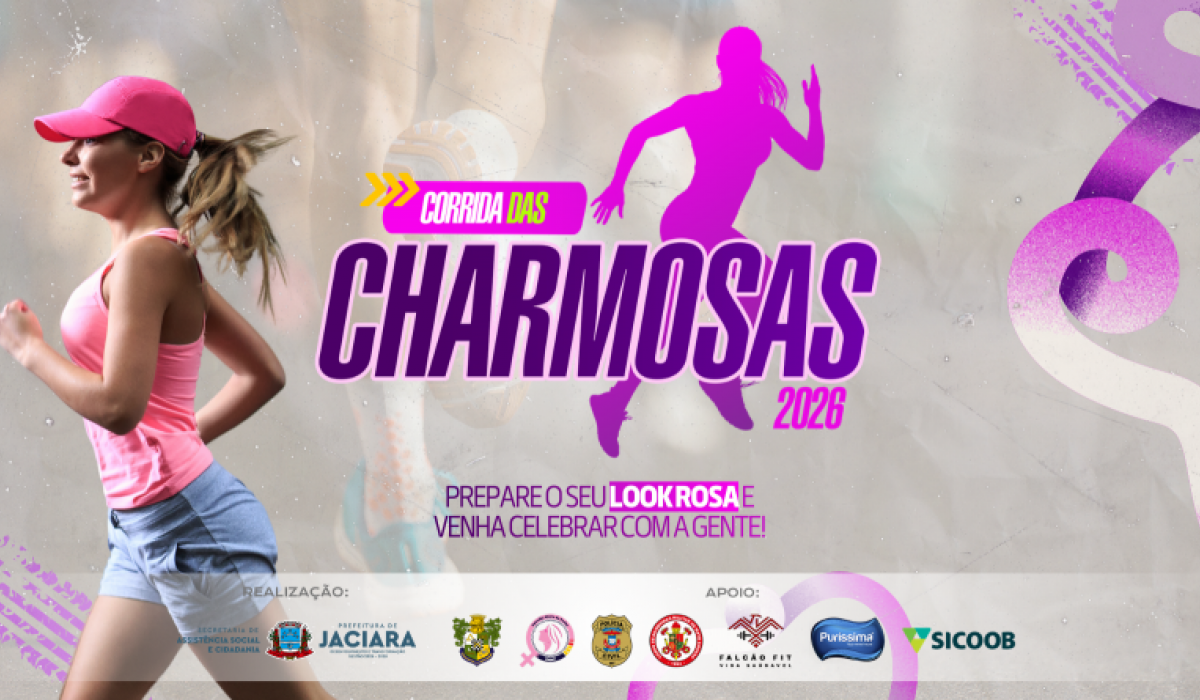 A Corrida das Charmosas 2026 é uma realização da Prefeitura de Jaciara, por meio da Secretaria Municipal de Assistência Social, com apoio da Polícia Militar, Patrulha Maria da Penha, Polícia Civil, Corpo de Bombeiros, Água Puríssima, Falcão Fit e Sicoob.