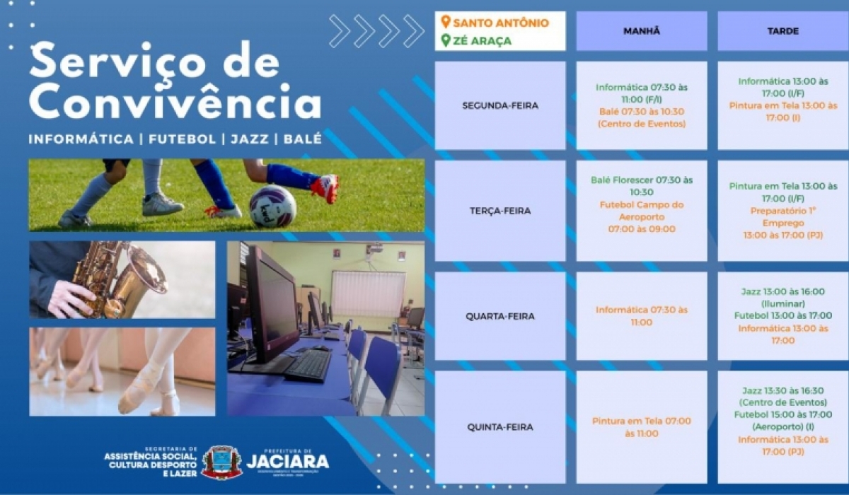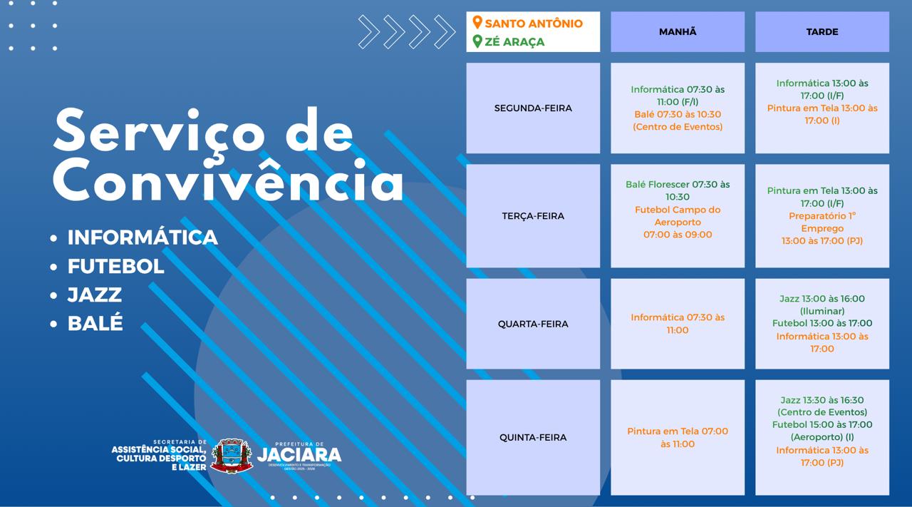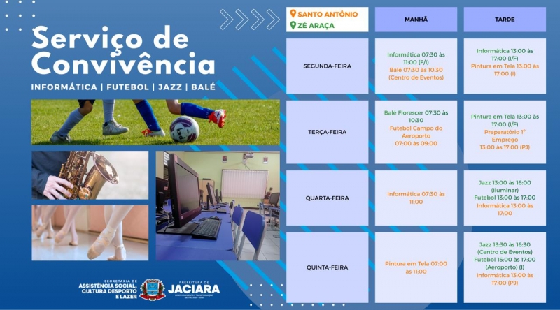 As inscrições serão realizadas no próprio CRAS Zé Araçá, nos períodos das 7h30 às 11h e das 13h às 17h. Estão sendo ofertadas vagas para cursos e atividades como informática, balé, jazz, pintura em tela e futebol.