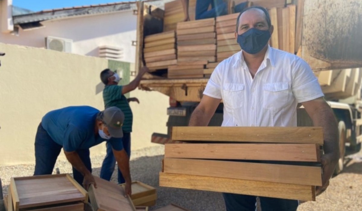 Nessa primeira remessa, foram adquiridas 250 caixas de abelha, custeada pelo próprio produtor, composta por uma colméia e duas melgueiras e com menor custo, já que o material é produzido por um ex-aluno do Senar-MT, que hoje também trabalha com apicultura e tem auxiliado pequenos produtores e facilitado o acesso às caixas por um valor bem abaixo do mercado.