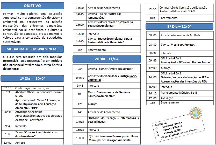 O curso tem como premissa a elaboração de Projetos de Educação Ambiental (PEA) para alguns desafios ambientais locais, bem como a elaboração da minuta do Plano Municipal de Educação Ambiental e a constituição da Comissão de Educação Ambiental do Município (CEAM).