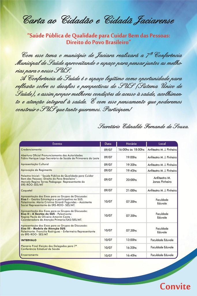 Com o tema “Saúde Pública de Qualidade para Cuidar Bem das Pessoas” Jaciara sedia a 7ª Conferência Municipal de Saúde, nos dias 9 e 10 de junho. O credenciamento começará a partir das 17 horas, no Anfiteatro Jonas Pinheiro.