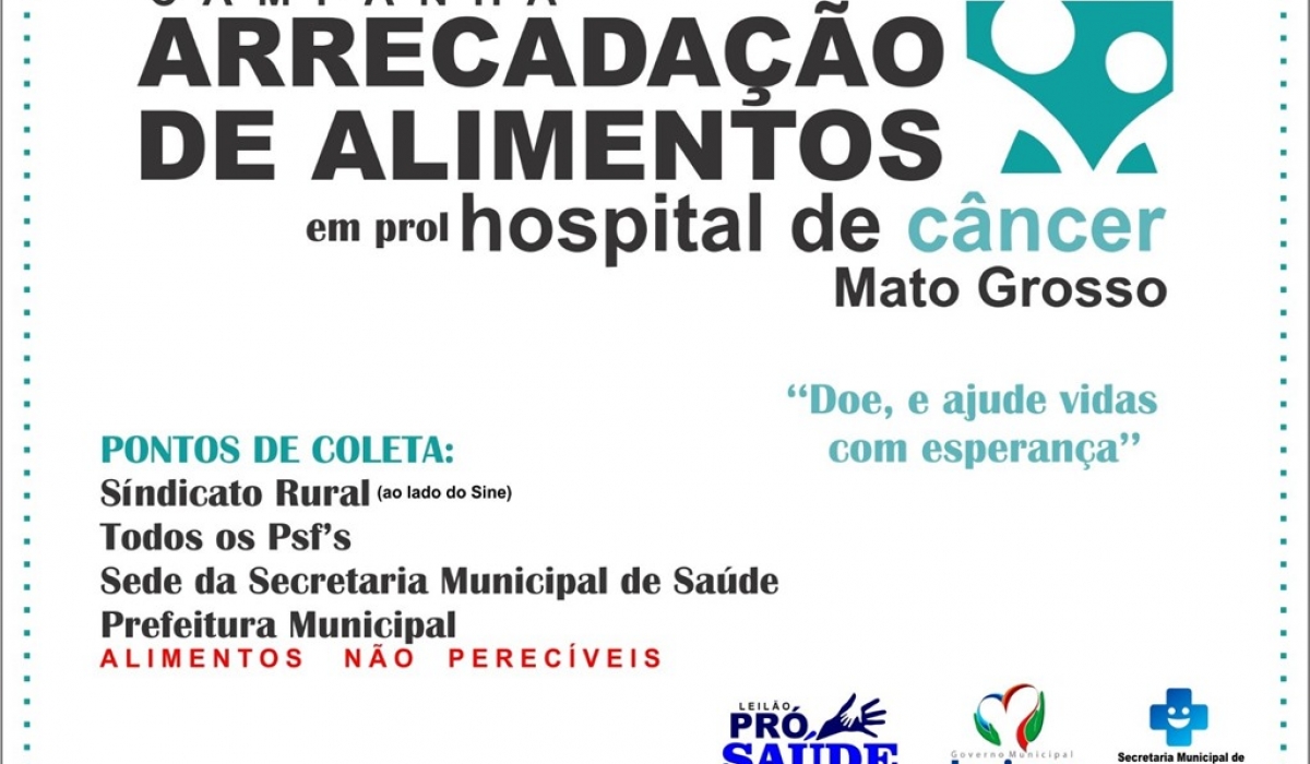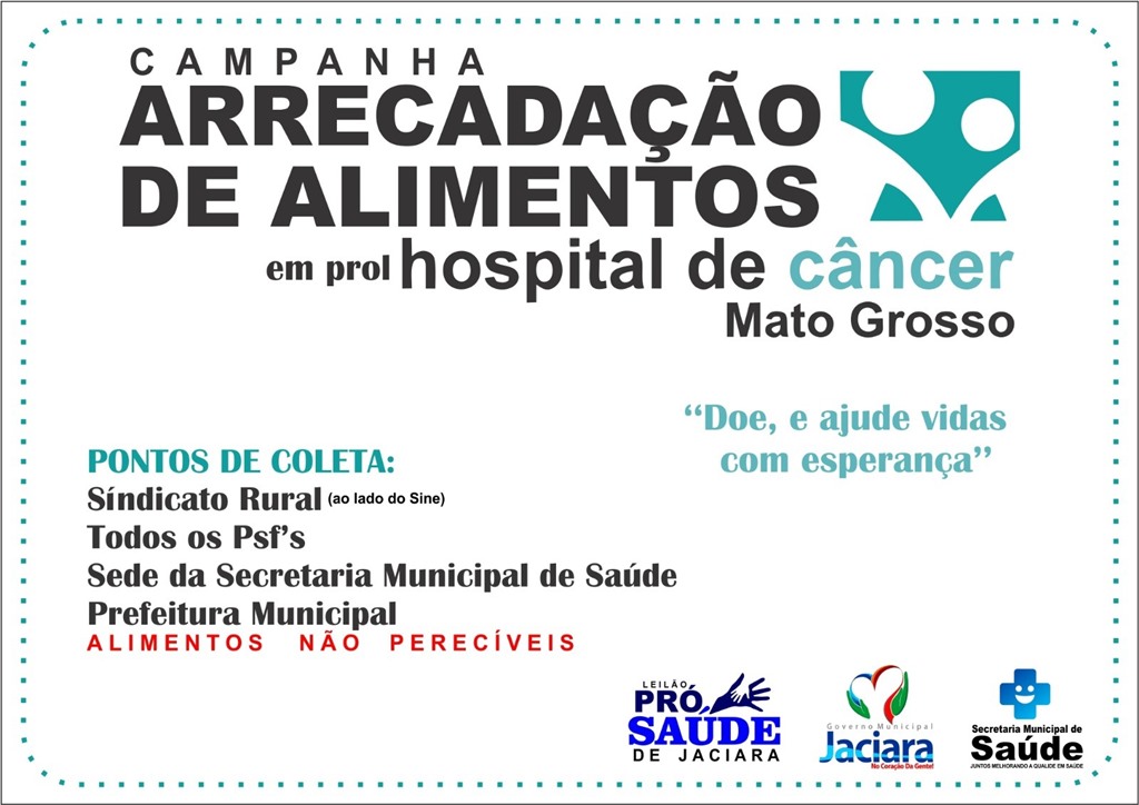 Seja solidário e doe esperança! Participe da Campanha de Arrecadação de Alimentos em Prol do Hospital de Câncer de Mato Grosso. As doações podem ser entregues na sede do Sindicato Rural de Jaciara, nos PSF´s, na Prefeitura Municipal e na Secretaria Municipal de Saúde até o dia 15 de abril.