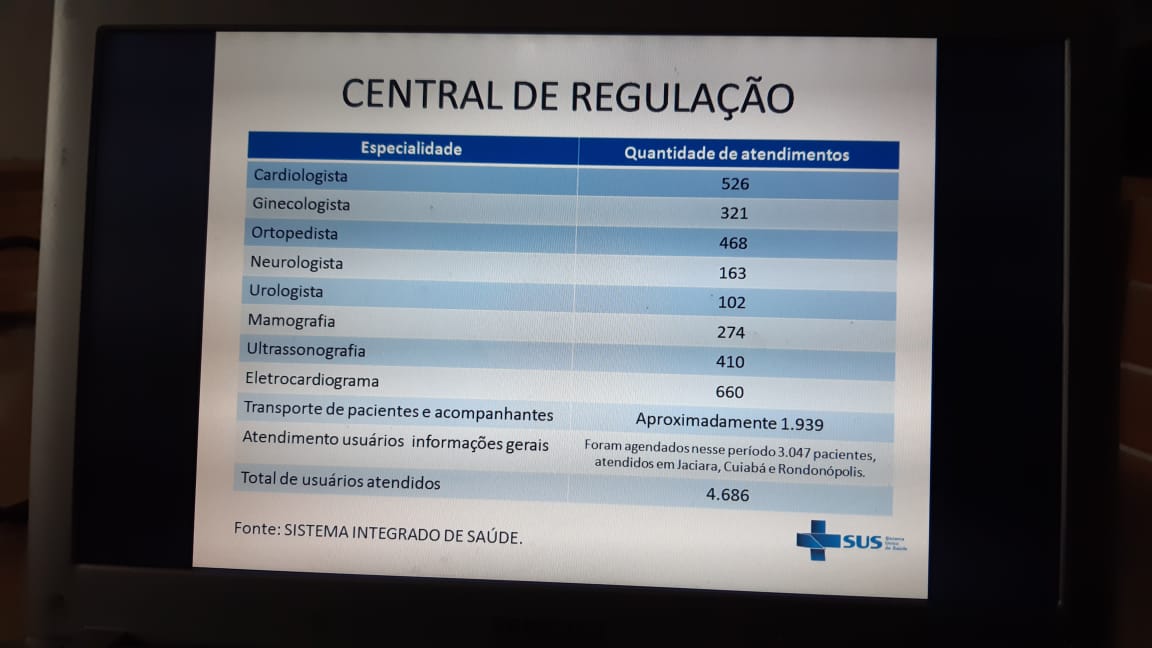 A Central de Regulação entre maio e agosto registrou 4.686 atendimentos e consultas com especialidades, sendo eles: cardiologia (526), ginecologia (321), ortopedia (468), neurologista (163), urologista (102), mamografia (274), ultrassonografia (410), eletrocardiograma (660) e transporte de pacientes e acompanhantes um total aproximado de 2.204. Só no mês de julho, mais de mil consultas e exames com especialidades, como mutirões com ortopedista, reumatologista, ginecologista, otorrinolaringologista, dentre outros.