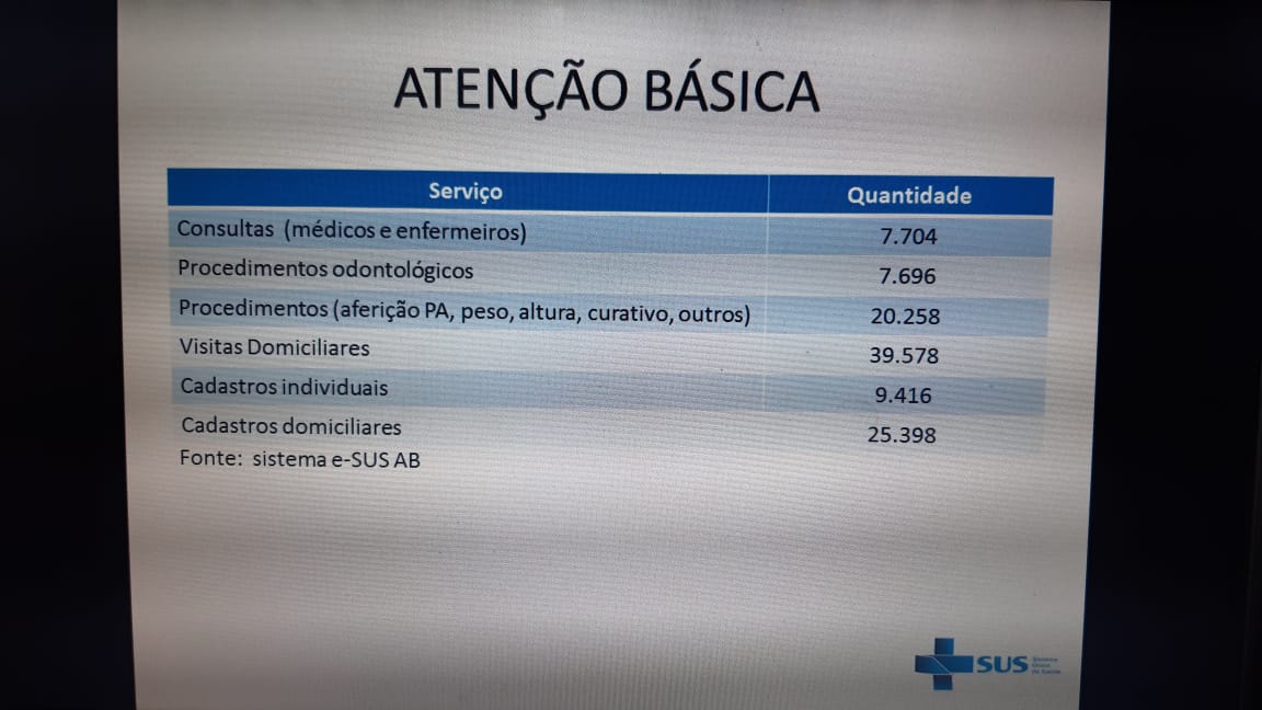 Segundo dados do Sistema e-SUS, na Atenção Básica, foram realizadas 7.704 consultas com médico e enfermeira nas Unidades Básicas de Saúde, 7.696 procedimentos odontológicos, 20.258 procedimentos como aferição de pressão arterial, peso, curativo, dentre outros, além de 39.578 visitas domiciliares. No mesmo período foram registrados 9.416 cadastros individuais e 25.398 domiciliares.