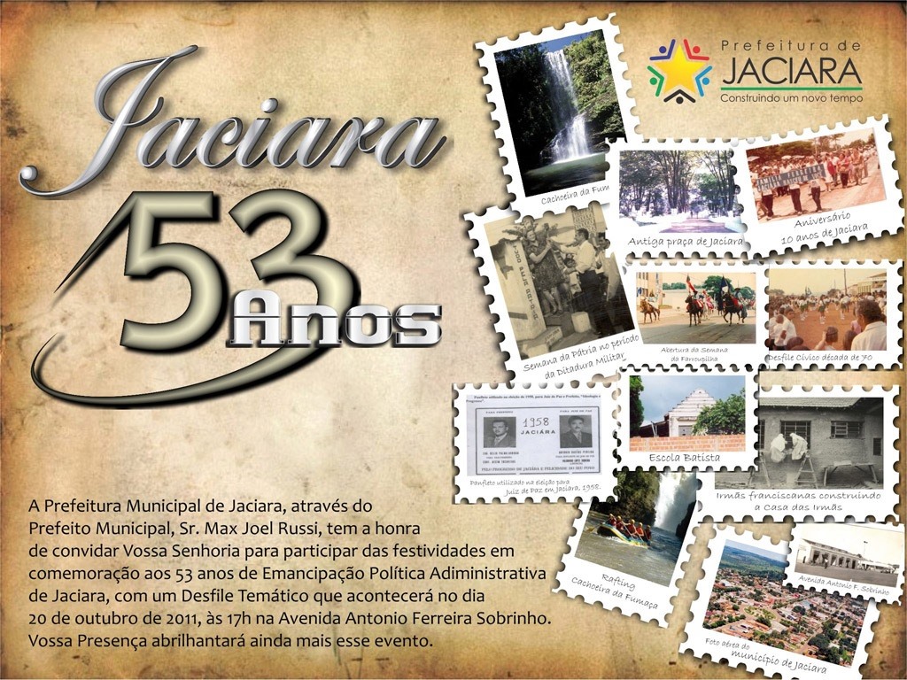 Para comemorar mais uma primavera, a Prefeitura de Jaciara tem o orgulho de convidar toda a população para prestigiar esse desfile em homenagem a todos que trabalham por uma Jaciara cada dia melhor, para que a cada ano de experiência ela cresça em harmonia com sua população.