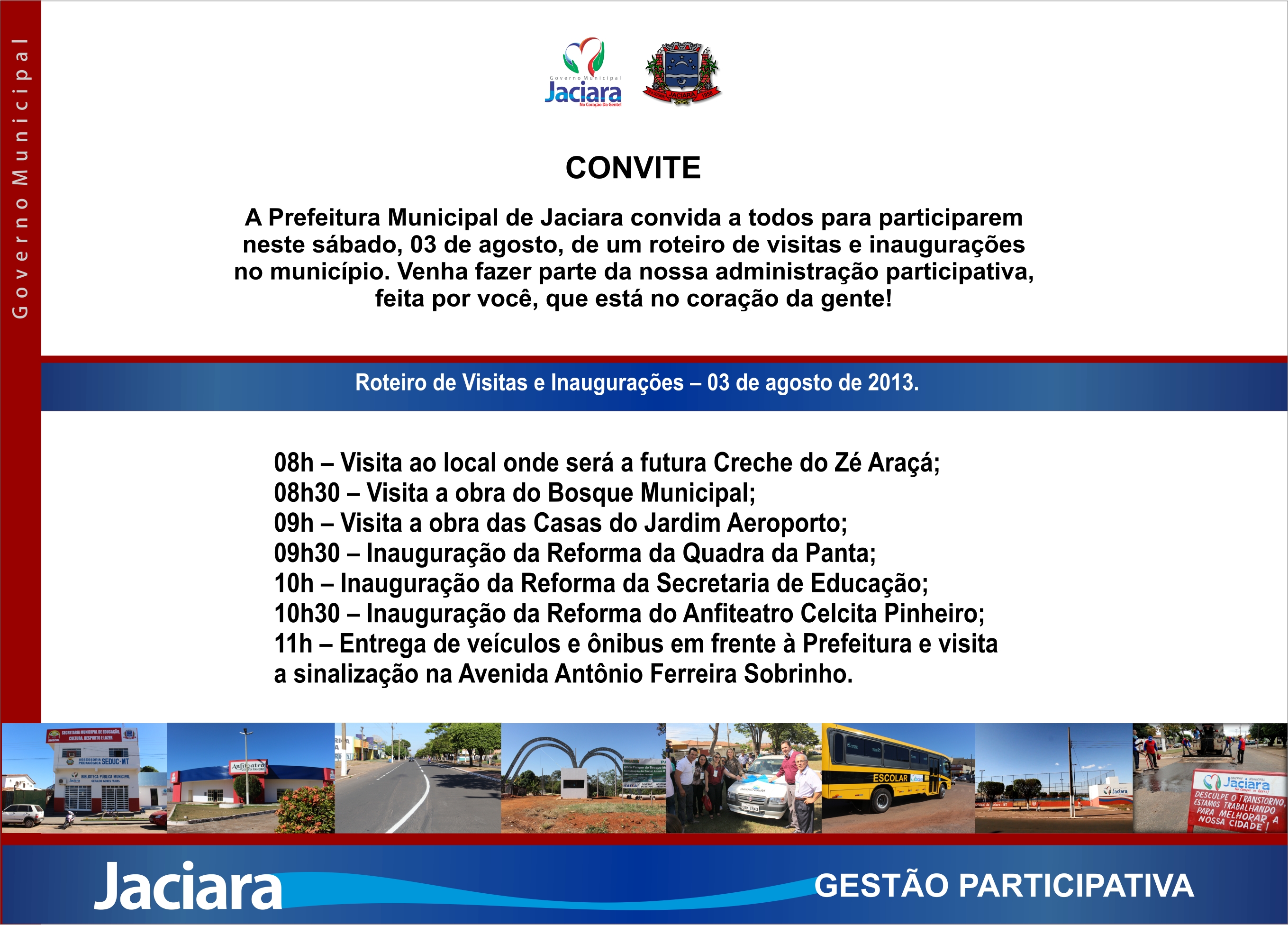 Neste sábado (03) a atual administração realizará um grande roteiro de visitas e inaugurações no município. A idéia é mostrar a toda a comunidade o que vem sendo feito em seis meses de gestão.