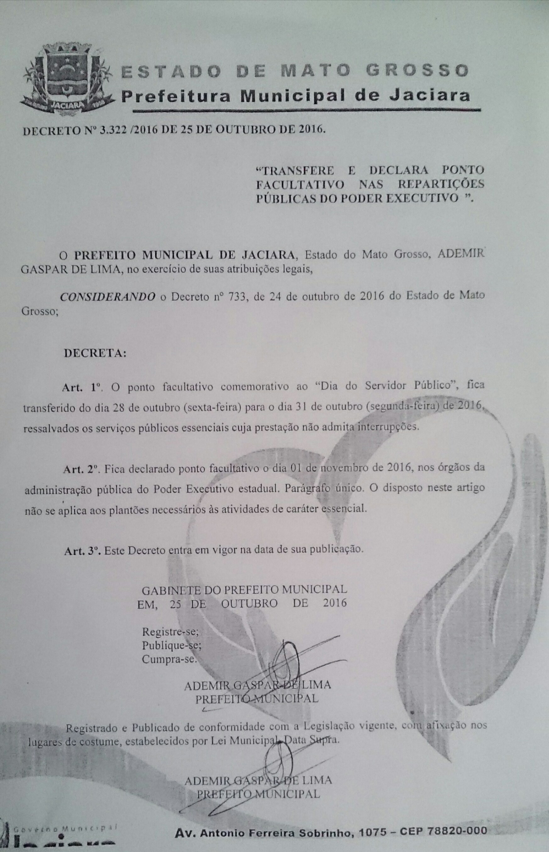 Em virtude ao Decreto nº 733/2016, do Governo do estado, o prefeito Ademir Gaspar de Lima no exercício de suas atribuições legais também transferiu e declarou ponto facultativo nas repartições municipais, transferindo o feriado do Dia do Servidor Público do dia 28 para segunda-feira (31).