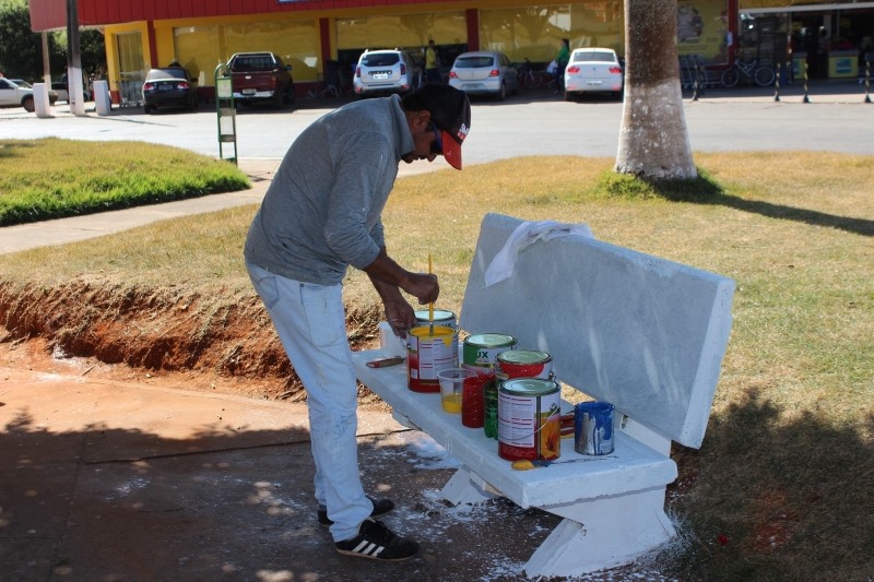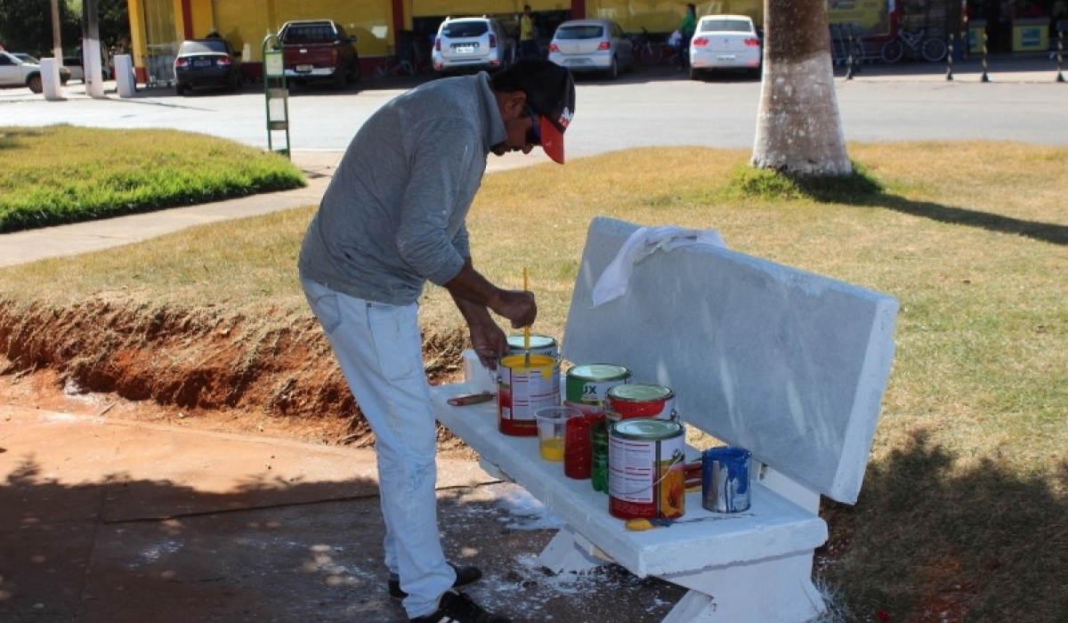 Todos os 20 bancos da praça foram pintados de branco e estão ganhando uma linda arte feita com tinta nas cores vermelha, amarela e verde. Algumas árvores que morreram serão retiradas do local para outras serem replantadas. Além disso, o coreto também receberá melhorias.