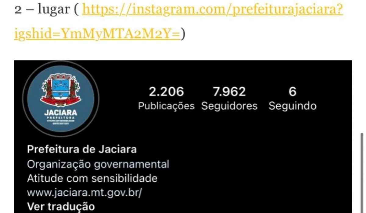 A página do Instagram da Prefeitura de Jaciara (ver aqui) foi avaliada pelo blog Clipping Comentado, do jornalista, colunista e especialista em Redes Sociais, Diego Saporski. A rede social do Executivo Municipal ficou em 2º lugar, por elaborar e destacar vídeos dinâmicos e conteúdos atrativos.