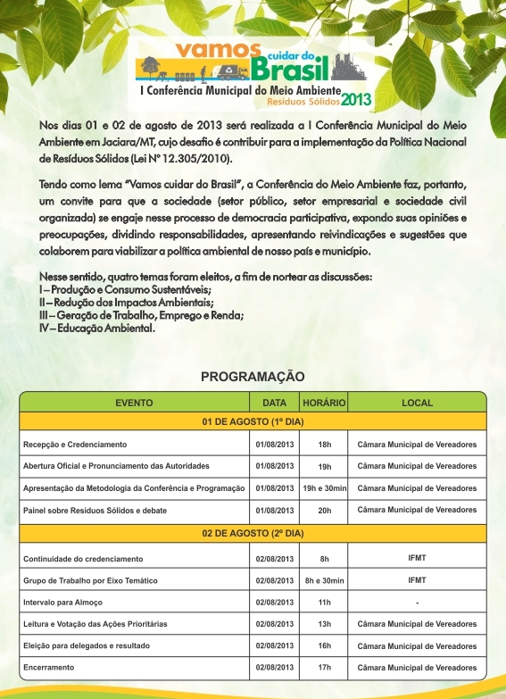 O evento é organizado pela Secretária Municipal de Meio Ambiente com o apoio da Prefeitura Municipal. A primeira Conferência tem como lema, “Vamos cuidar do Brasil” e acontecerá nos dia 01 e 02 de agosto, com abertura na Câmara dos Vereadores a partir das 18h.