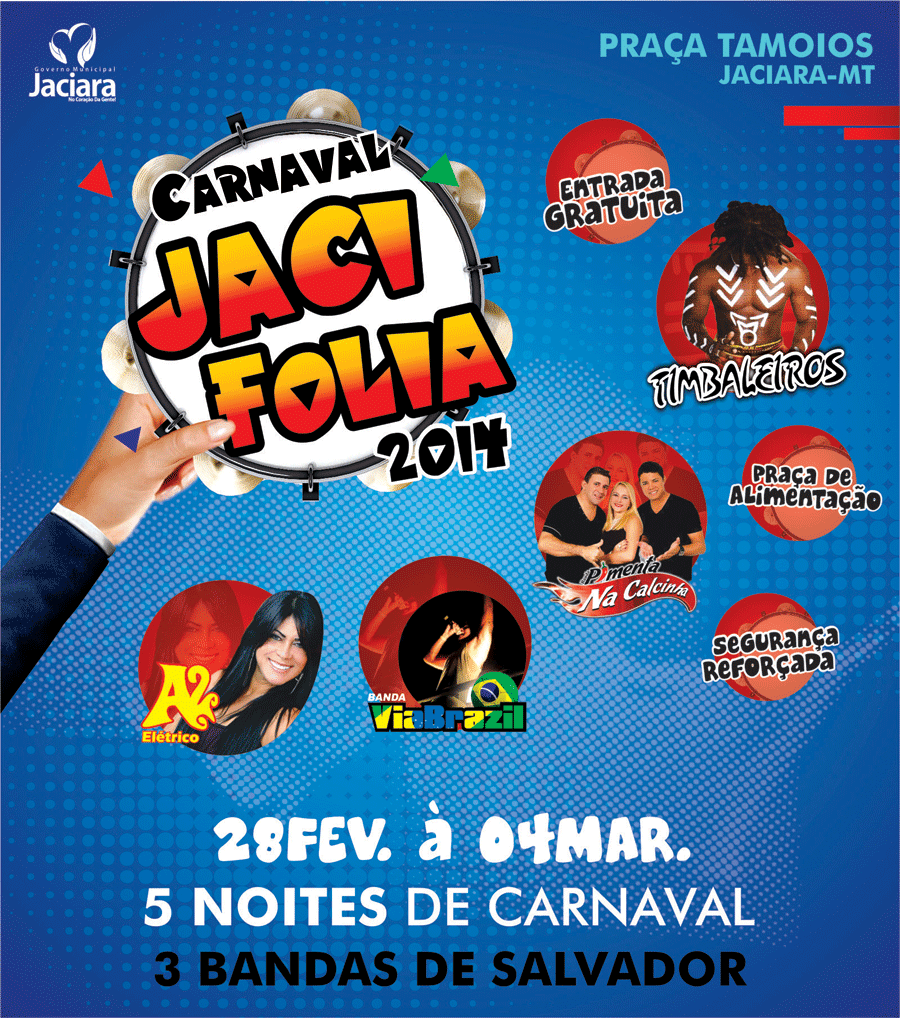 Já estão confirmadas as atrações que vão comandar o melhor e maior carnaval de rua do Vale do São Lourenço e da região sul de Mato grosso. A edição 2014 do Jacifolia terá animação de quatro bandas nacionais, diretamente de Salvador e Goiás, para o circuito do carnaval jaciarense, que acontecerá de 28 de fevereiro a 04 de março, na praça central da cidade.