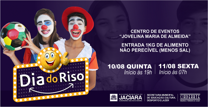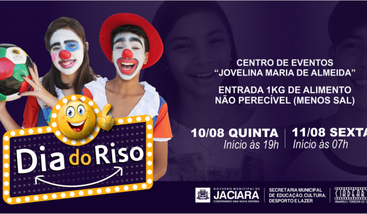 O Governo Municipal de Jaciara por meio da Secretaria de Educação, Cultura, Desporto e Lazer em parceria com a Secretaria de Assistência Social realiza o Dia do Riso, no dia 10 de agosto, quinta-feira, às 19h e no dia 11, sexta-feira, às 7h, no Centro de Eventos.