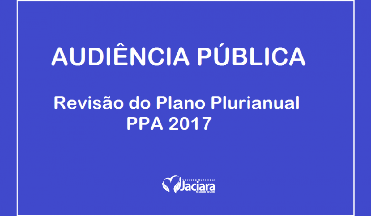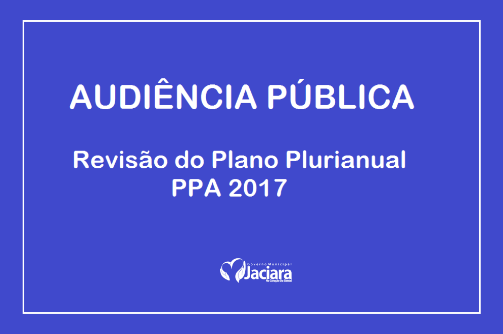 A Administração Municipal convoca você, cidadão jaciarense, para participar da Audiência Pública para Revisão do Plano Plurianual (PPA) 2017, que acontecerá nesta sexta-feira (18.11), às 17 horas, no Plenário da Câmara Municipal de Vereadores, situada na Rua Jurucê, 1301, Bairro Centro.