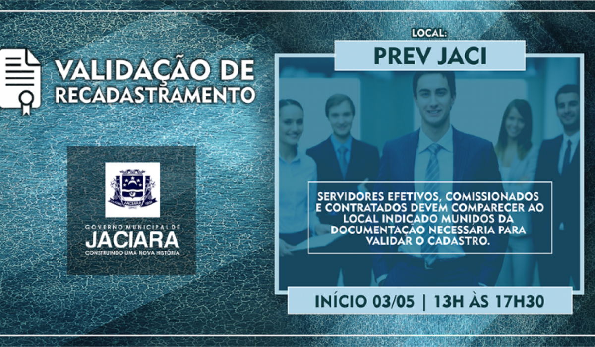 A Prefeitura Municipal de Jaciara por meio da Secretaria de Administração e Finanças convoca todos os servidores efetivos, comissionados e contratados a efetuar a segunda etapa do recadastramento de pessoal. O prazo vai até 30 de maio de 2017, das 13h às 17h30.