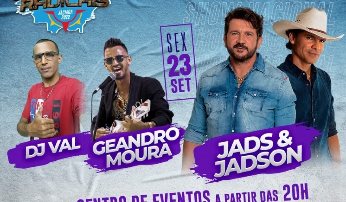 A dupla sertaneja catarinense Jads e Jadson, o cantor e compositor cuiabano Geandro Moura, além do DJ Val, são as atrações do sétimo show da 13ª Temporada de Esportes Radicais de Jaciara, que será realizado nesta sexta-feira (23.09) no pátio do Centro de Eventos, no bairro Planalto.
